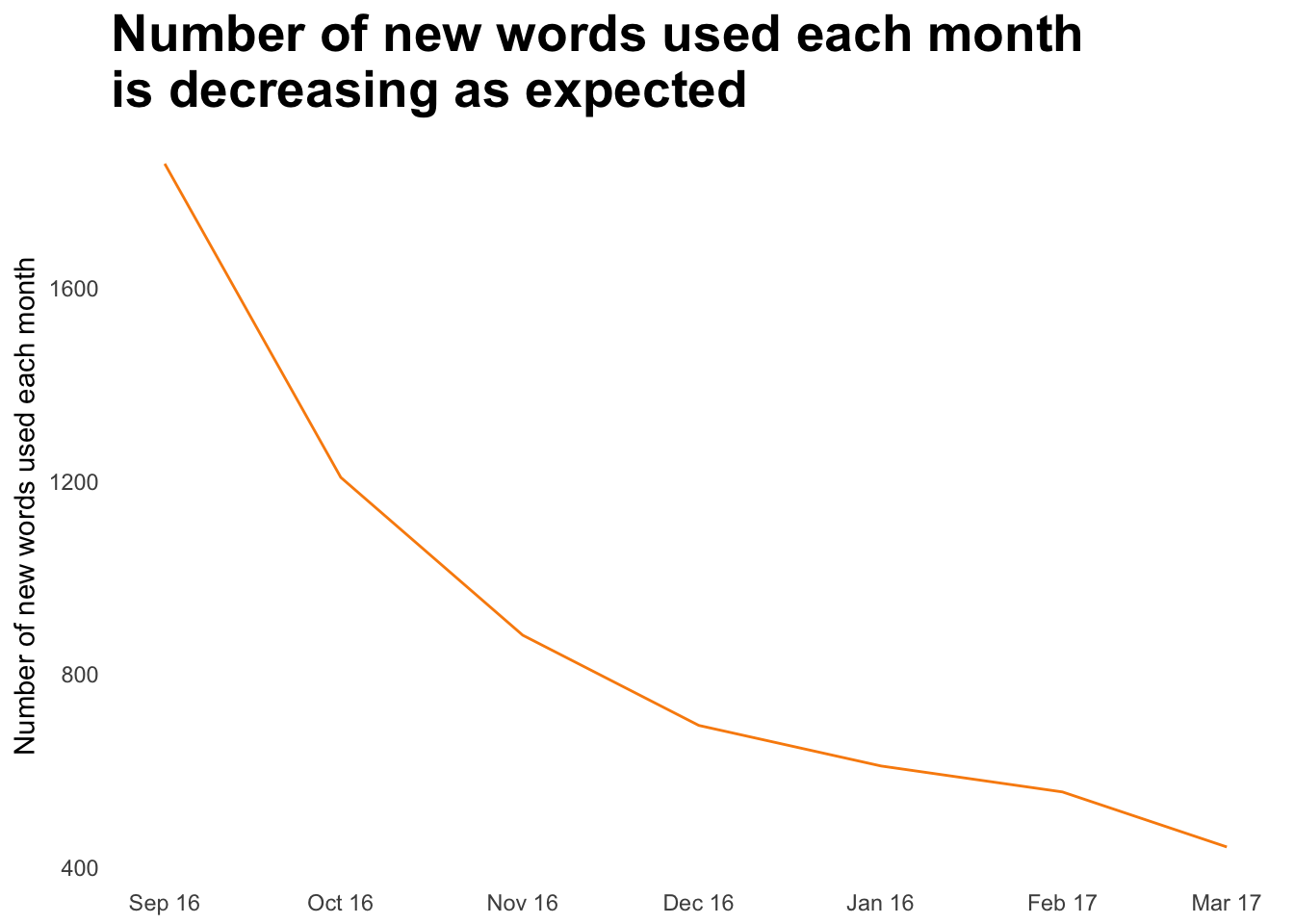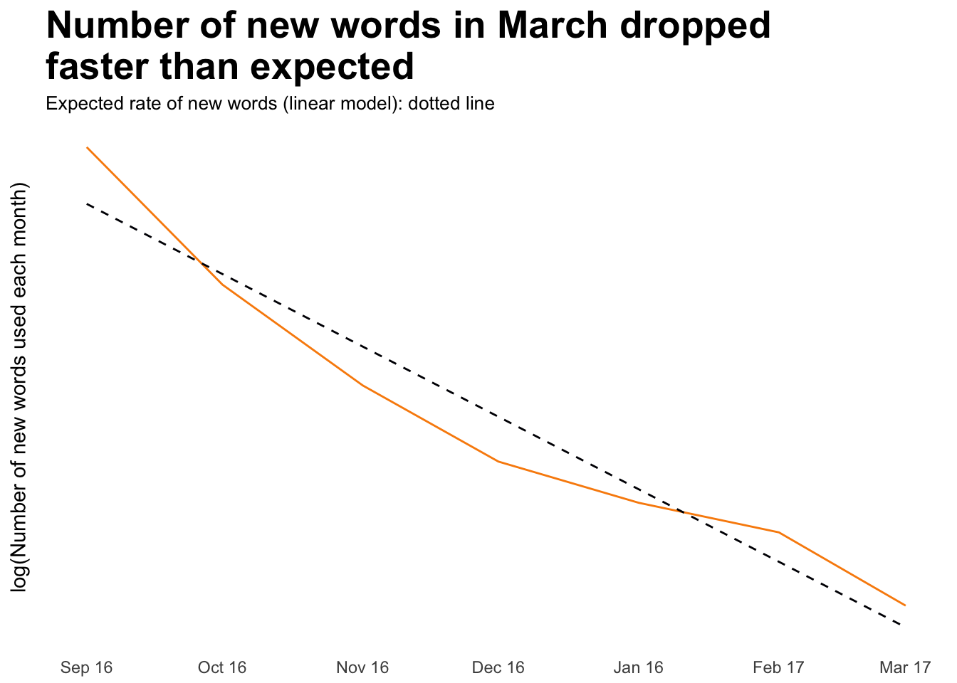 Or one could argue that March is the normal rate and it was in October and November 2016 that the rate was high and then it slowed down as the year turned. The dotted line shows a linear trend which means the slow down of new words is constant each month.