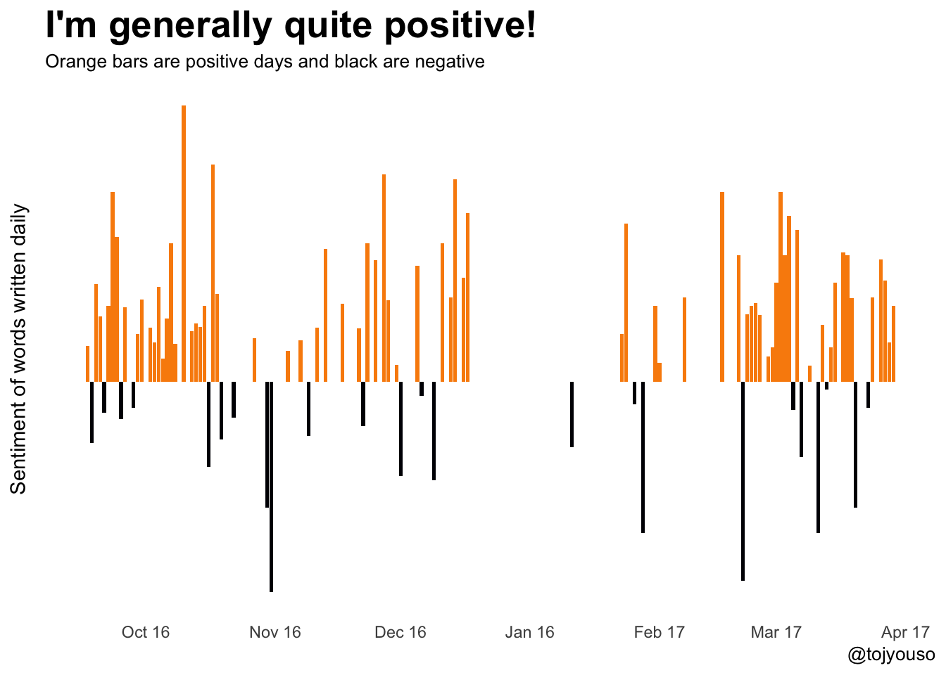 Turns out I’m usually positive - probably because I’ve been blessed with a lot of good things in my life. I checked what happened at the end of October 2016 where there is a small cluster of negativity - it was when my wife AND my mum were ill :(. The negative days are quite sporadic and it’s rare to see more than one in a row. That makes me happy, it means there isn’t some underlying unhappiness. The fact that there aren’t clusters of bad days also suggests that things that make me sad or angry or experience other negative emotions are probably not that big a deal if they only last one day. That’s an important realisation and one I’ll keep in mind in the future when I’m having a bad day.