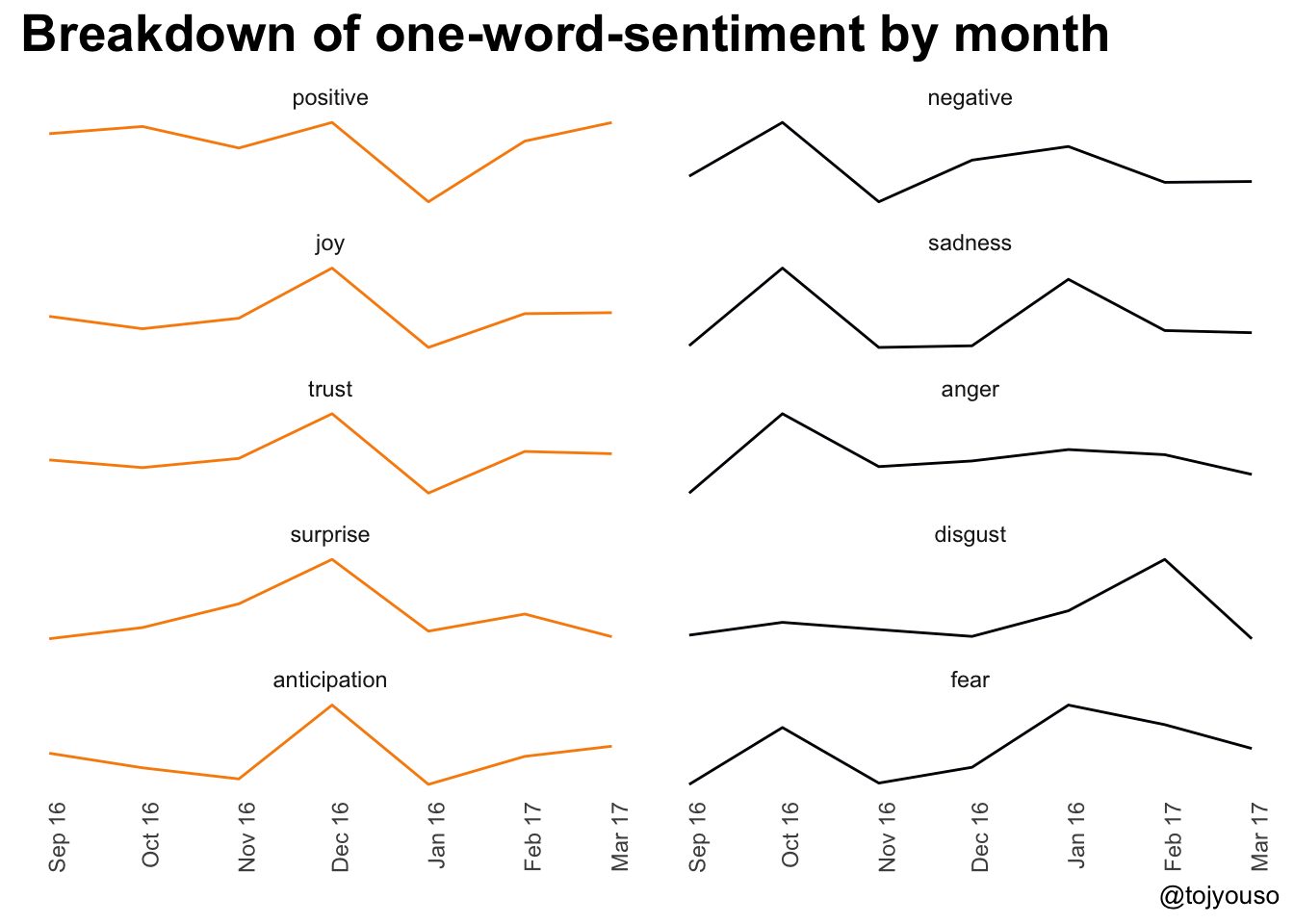The positive emotions are all highly correlated with the peak in December 2016 and trough the next month. The negative words are all a bit different. The spike in Feb of disgust is interesting and I spent October being angry and sad (that’s probably driven by the end of October times when my wife and mum were ill). I will need to explore February’s disgust.