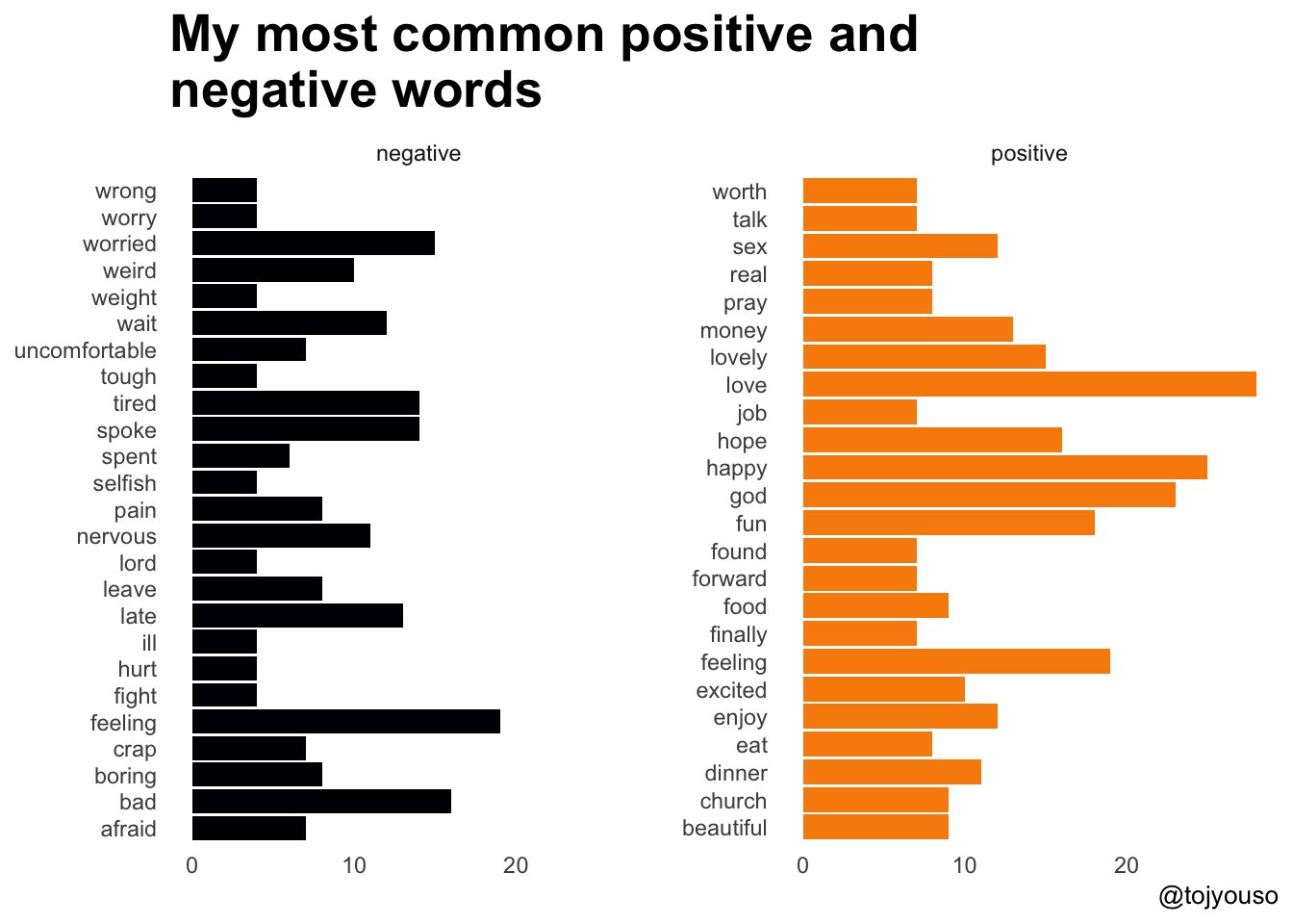 I can also show which of my most common words contribute most to the positive and negative sentiments. love, happy and god are my most common positive words :). I do write Thank God quite often! Money is quite high up there too haha and so is sex ;).