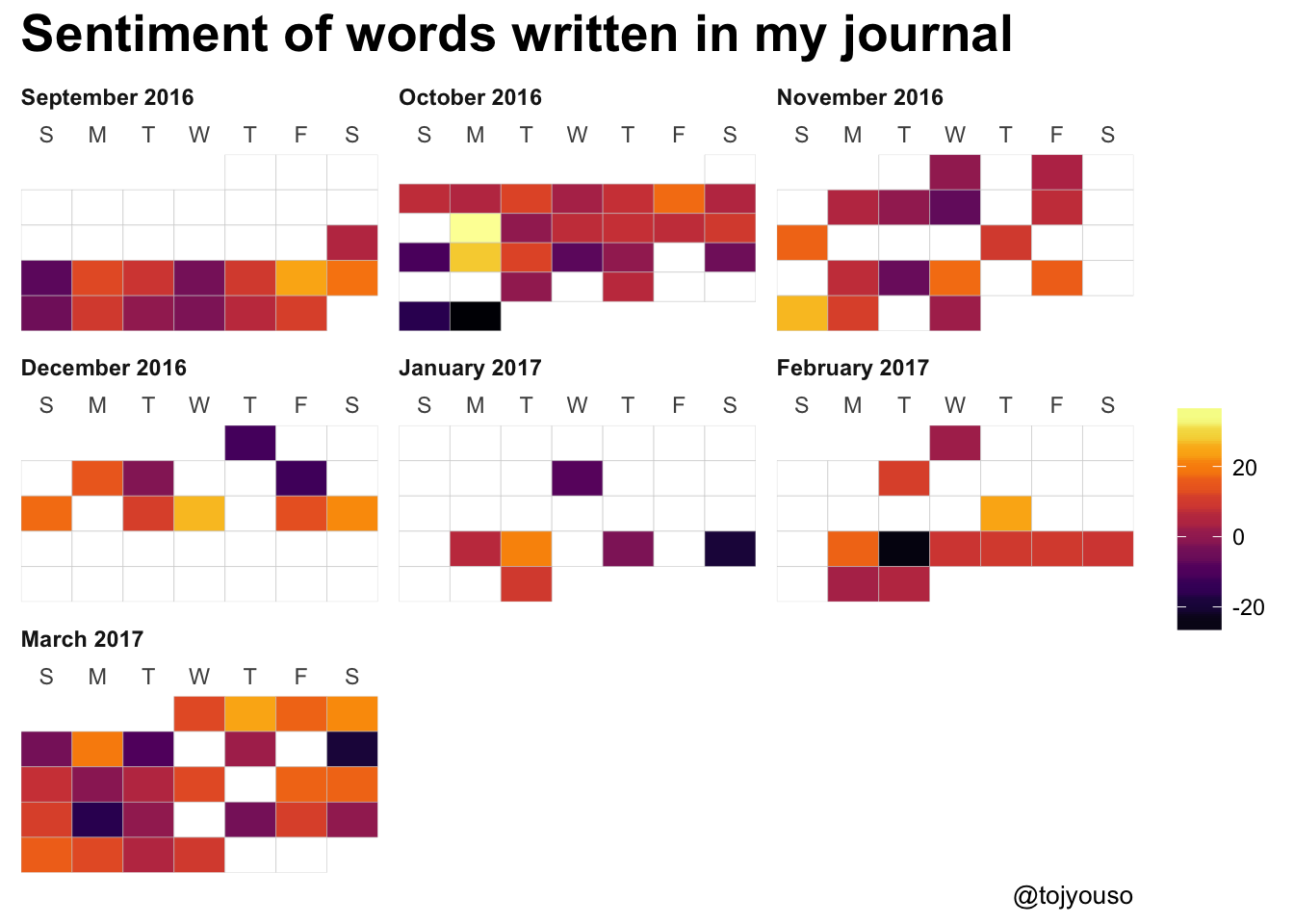 I can also use my new favourite calendar plot to see when I write the most positive words. Ultimately, I want to be able to click on a date and see what notes I wrote there but that is way beyond my current ability right now.