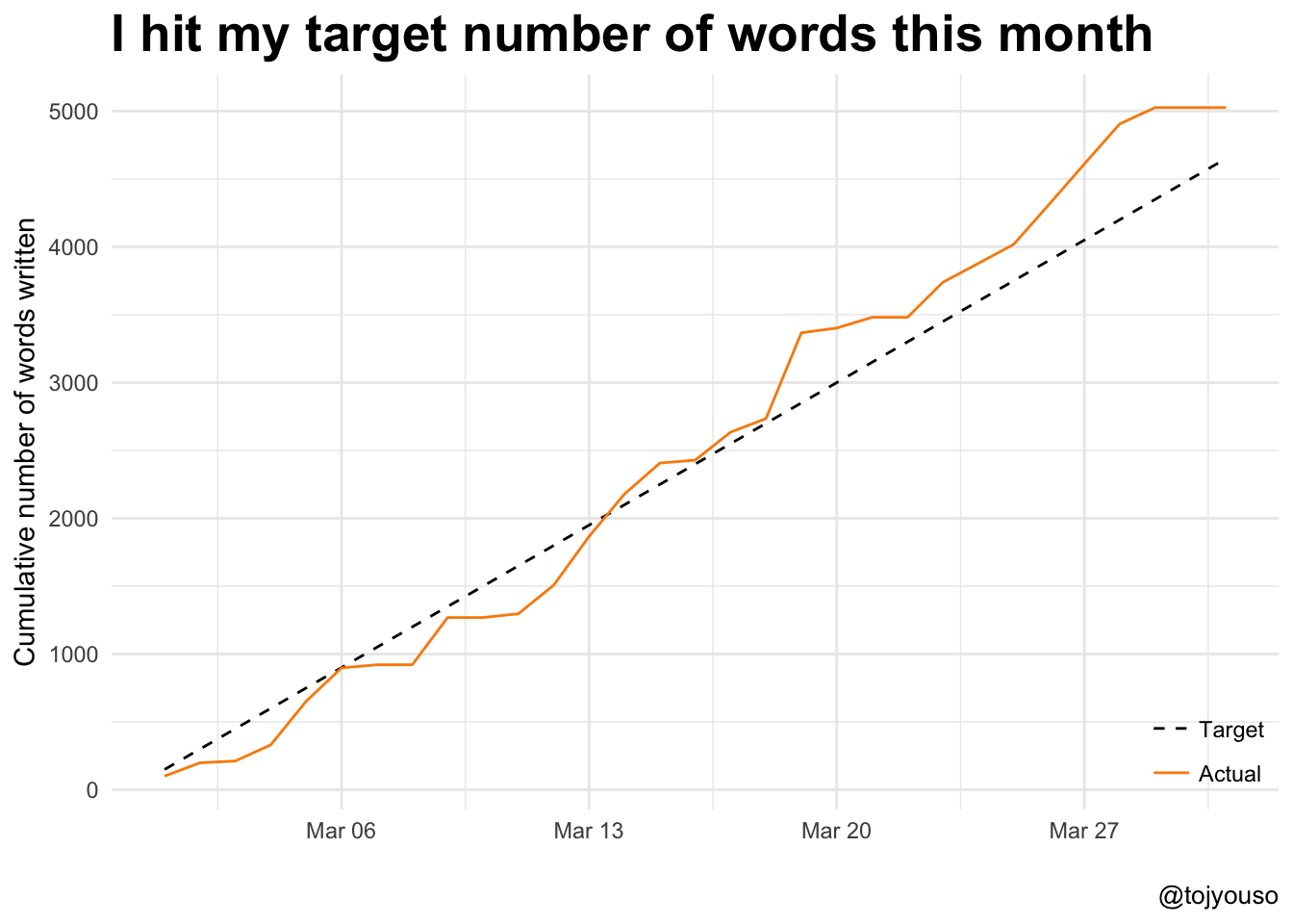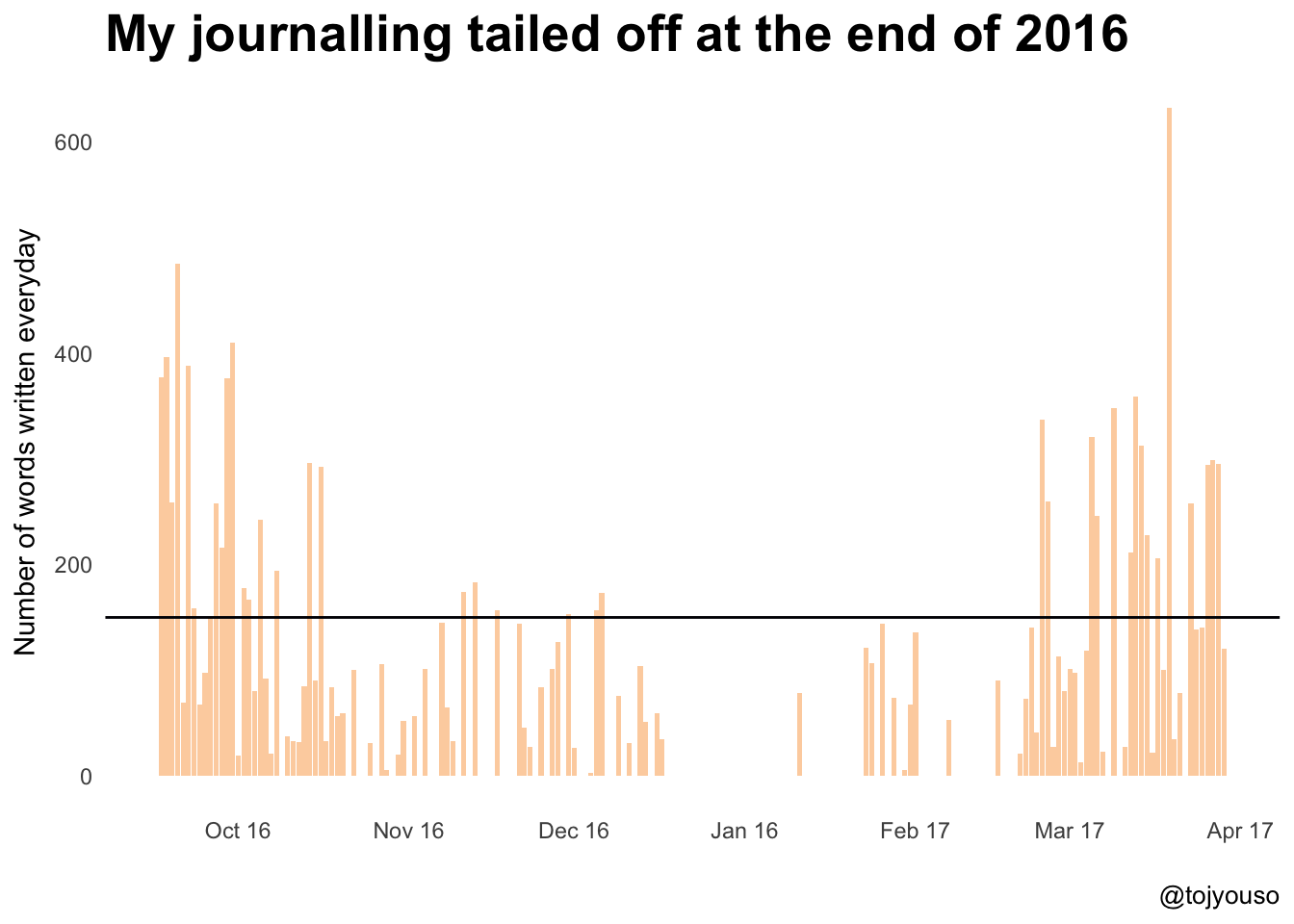 I wish I had recorded more during that end of year period, it was an important part of my life - my wife and I were considering a move from London to Oslo! (spoiler alert - I’m writing this on our new dining table in Oslo). Since then I’ve set my self a target of an average of 150 words a days. This is how I track this monthly: