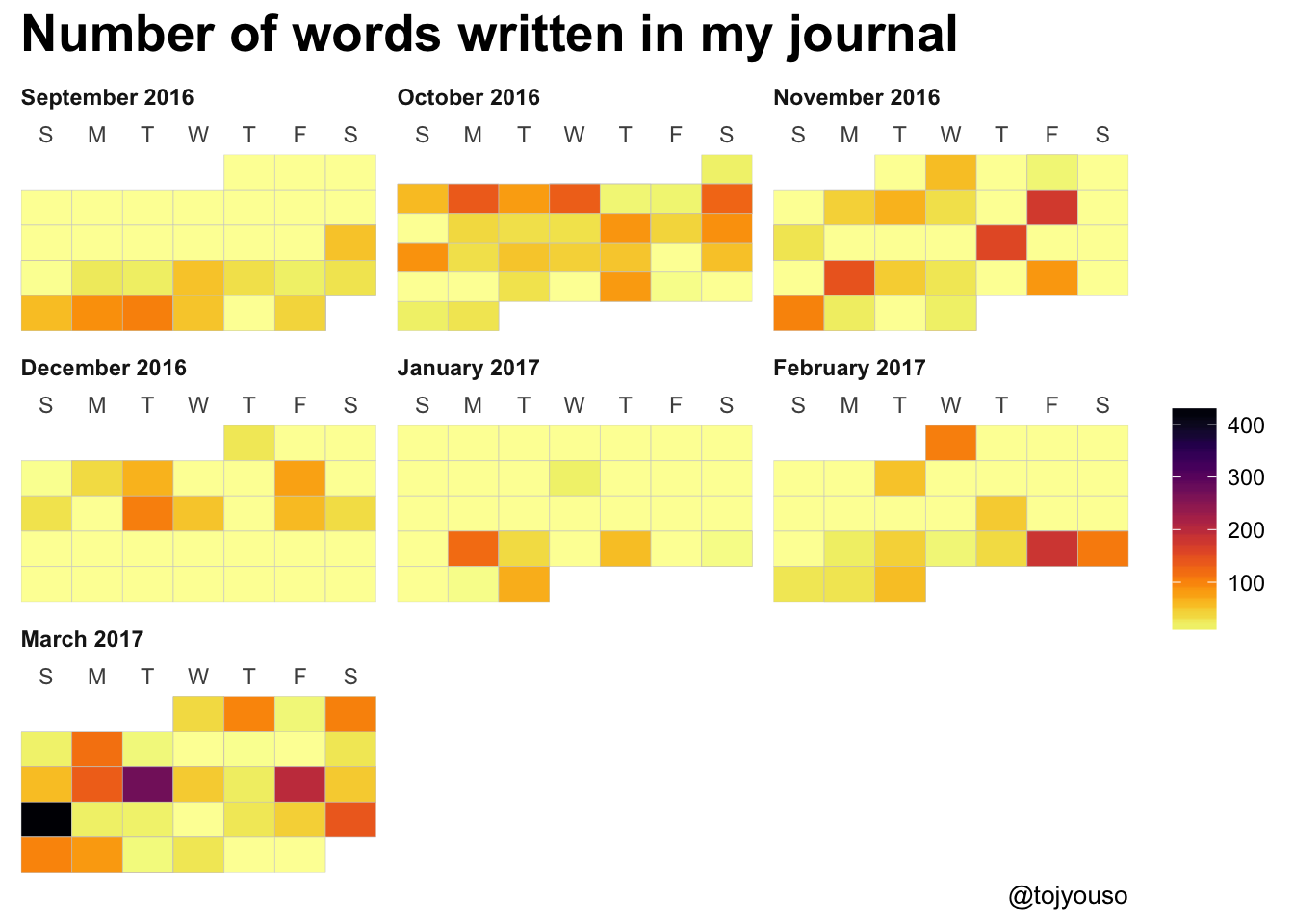 I’m also trialling the new ggcal package as a way to show how often I journal. I like it! I have also moved to using the colour palette from the viridis package, great for those who are colour blind and I like how bright the colours are.