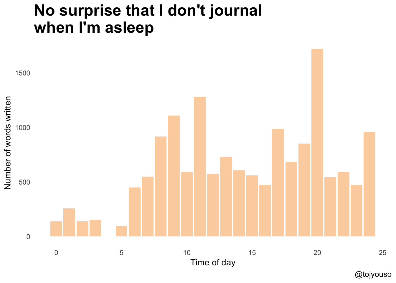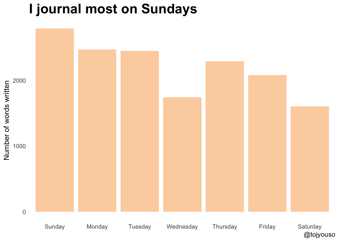 In terms of days in the week, I journal most on Sundays - again not surprised by that given that’s usually my day of reflection. We also used to have a very long London underground journey to and from church without internet - so I used to journal then to pass time. Saturday is low because I’m probably busy doing something else!