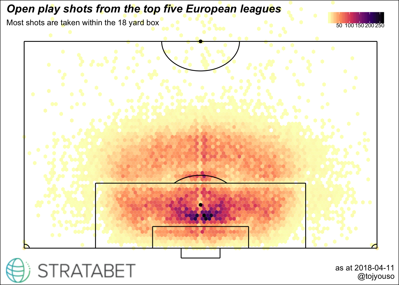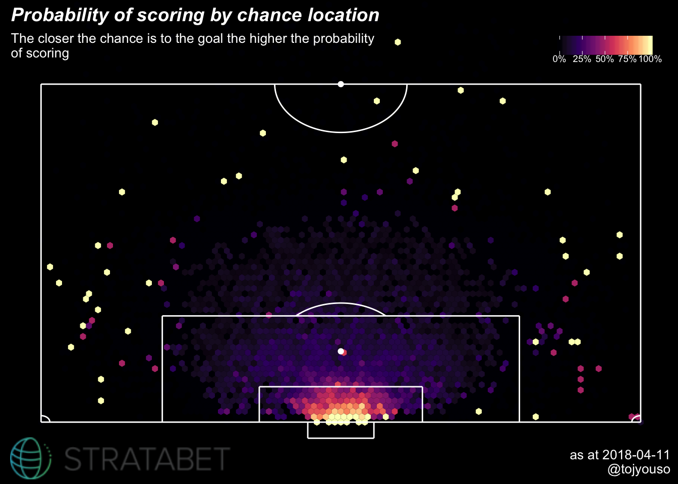 This is all chances (excluding penalties) in the highest division of the top 5 European football leagues. There were 79127 chances which doesn’t give a meaningful plot so I have summarised them into small hexagons where the lighter the hexagon the higher the proportion of goals scored from that hexagon. So if you ignore the sparse data and focus on where there is volume, it shows that location plays a huge part in the success of a chance.